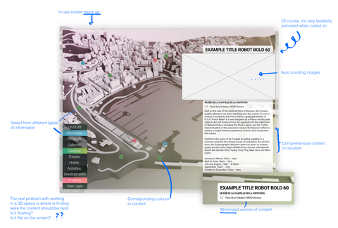 With placing layers of information hidden and selectable and activated through a press sensitive pop up menu it unclutters and naturally splits groups of content together, all the Hotels in one, Bars + Restaurants in another. By overlaying the content on the screen surface and also placing it in the 3D space I was able to separate the content into physical and informational areas – using the natural association for the user to what is physical and what’s not.